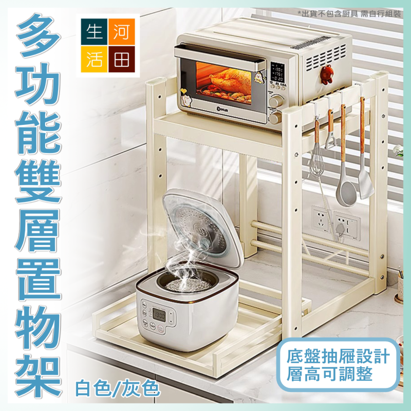 廚房多功能雙層置物架(奶白色) | 底盤抽屜設計 拿取廚具省力方便 | 層高可調整 適合大部分廚房用品